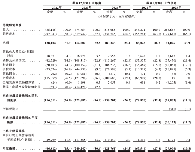 2022年、2023年、2024年和2025年上半年(下称报告期),安诺优达营收分别为4.35亿元、 4.75亿元、5.18亿元和2.69亿元(人民币,下同);毛利分别为1.38亿元、1.55亿元、1.83亿元和0.91亿元;毛利率分别为31.7%、32.6%、35.4%和33.9%;年度亏损分别为0.67亿元、2.4亿元、1.26亿元和0.29亿元,年内亏损率分别为15.4%、50.6%、24.3%和10.8% 。