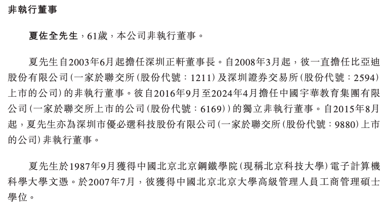 招股书显示,夏佐全,61岁,安诺优达非执行董事。自2008年3月起,一直担任比亚迪股份有限公司非执行董事。同时,夏佐全还担任深圳正轩董事长、 优必选非执行董事。此外,自2016年9月至2024年4月,其还担任宇华教育的独立非执行董事。