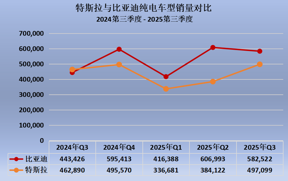 笔者近日从比亚迪获悉:2025年第三季度,其纯电车型全球销量582522辆,相比同期特斯拉497099辆的数据,单季度领先85423辆,这也是自去年第四季度以来,比亚迪连续四个季度在全球纯电市场的销量超过特斯拉,成为全球新能源市场名副其实的领头羊。