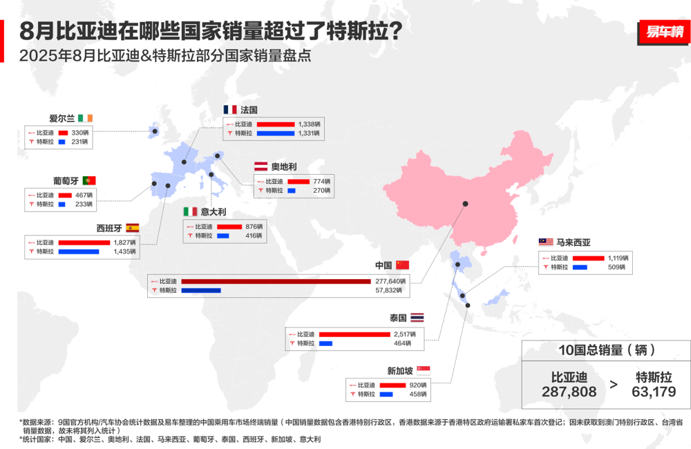 另据比亚迪官方数据,今年1~9月,其海外销量突破70万辆。据易车数据显示,2025年8月,比亚迪在西班牙、法国、意大利、爱尔兰、葡萄牙、奥地利等欧洲国家,以及新加坡、泰国、马来西亚等东南亚国家,销量均超过了特斯拉。