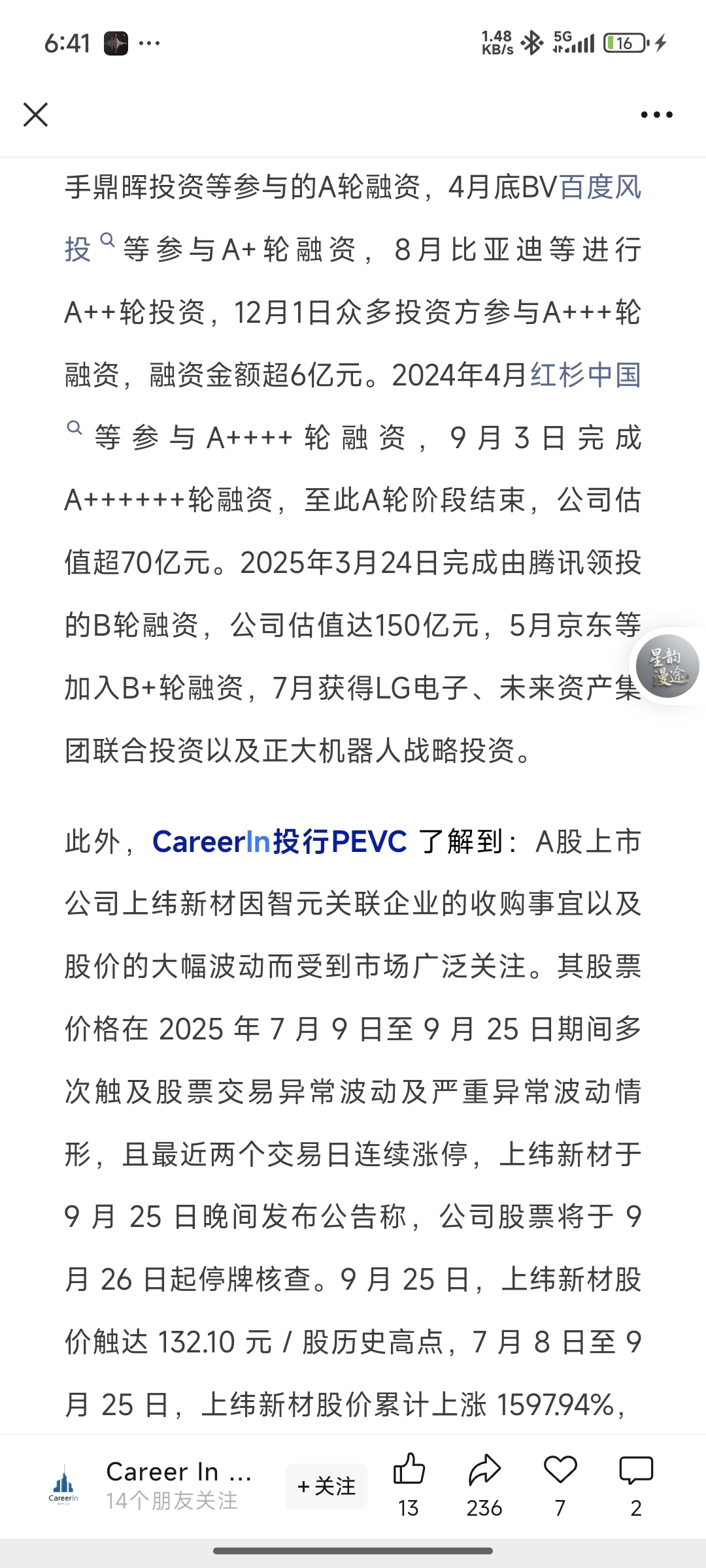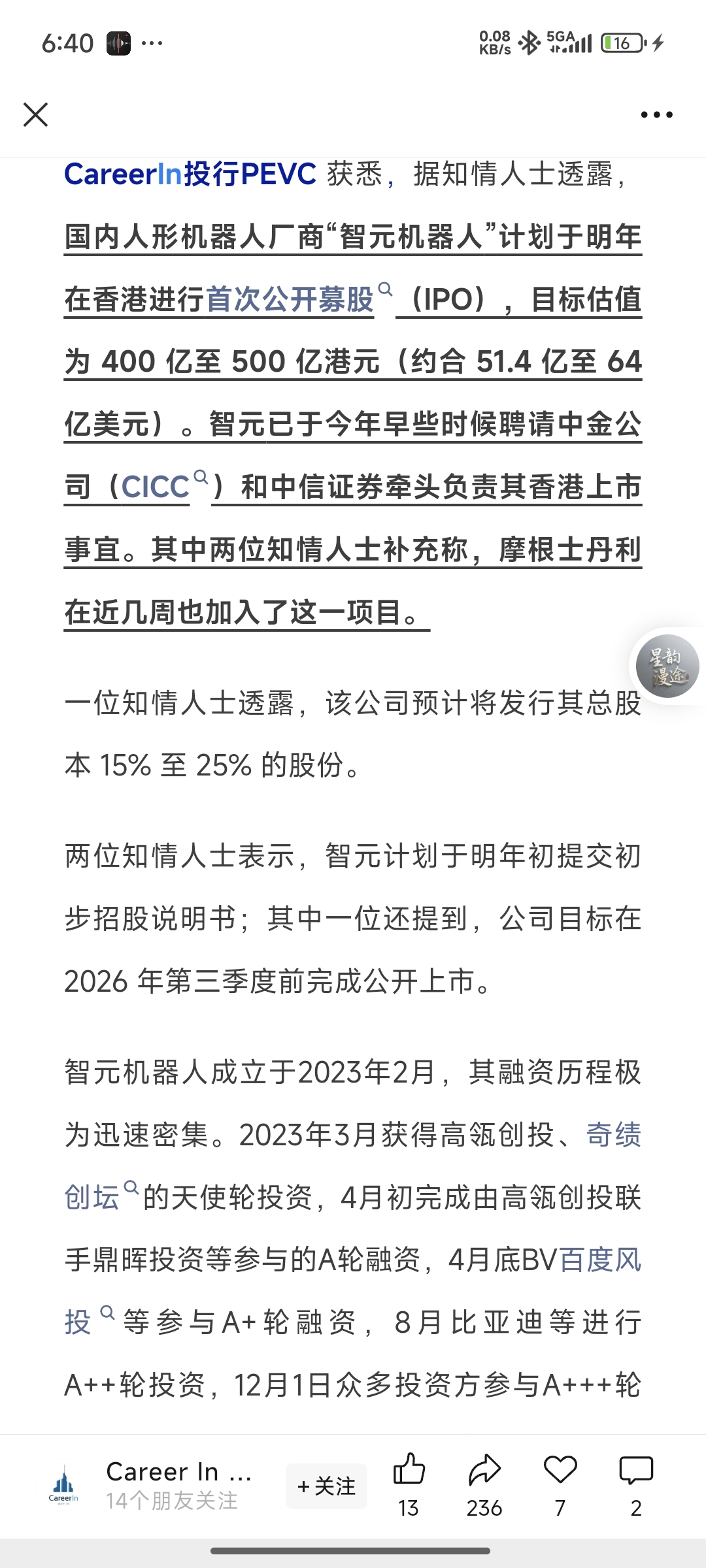 $比亚迪股份-一百(HK|01211)$ $比亚迪(SZ002594)$ 比亚迪参股的人形机器人公司即将上市。比亚迪于2023年8月投资了智元机器人(上海智元新创技术有限公司),持股比例从最初的3.76%调整至2025年的2.38%(含员工跟投平台),双方在人形机器人研发、工业场景应用等领域展开协同,例如智元机器人在比亚迪汽车工厂测试执行任务,并采用比亚迪的轻量化动力模组。