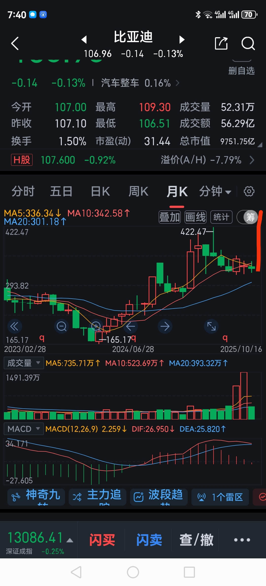 2025年7月29日大比例送股除权之后。比亚迪股价在103元-110之间横盘震荡了7个星期!
