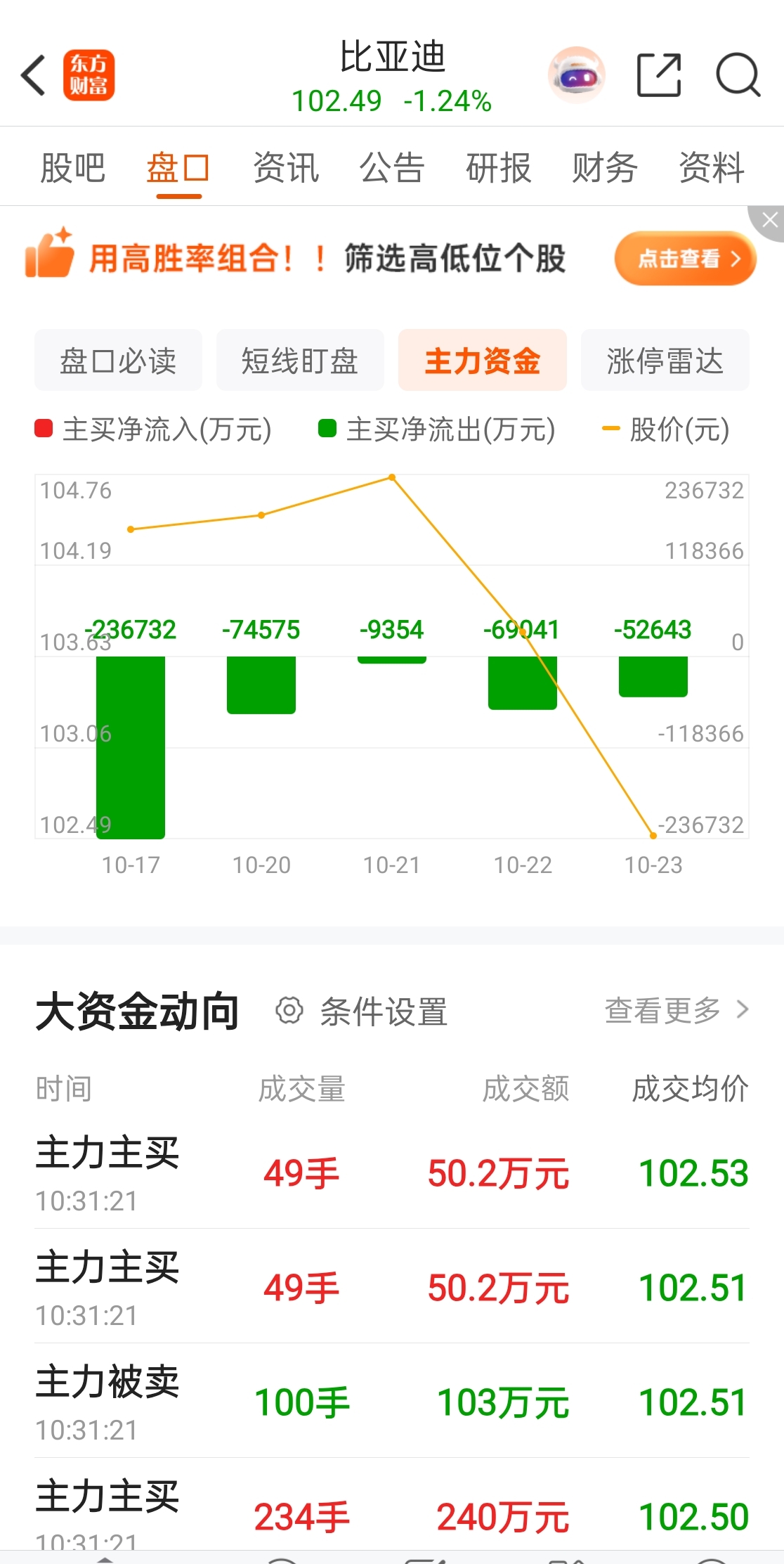 $比亚迪(SZ002594)$ 主力资金一直在流出