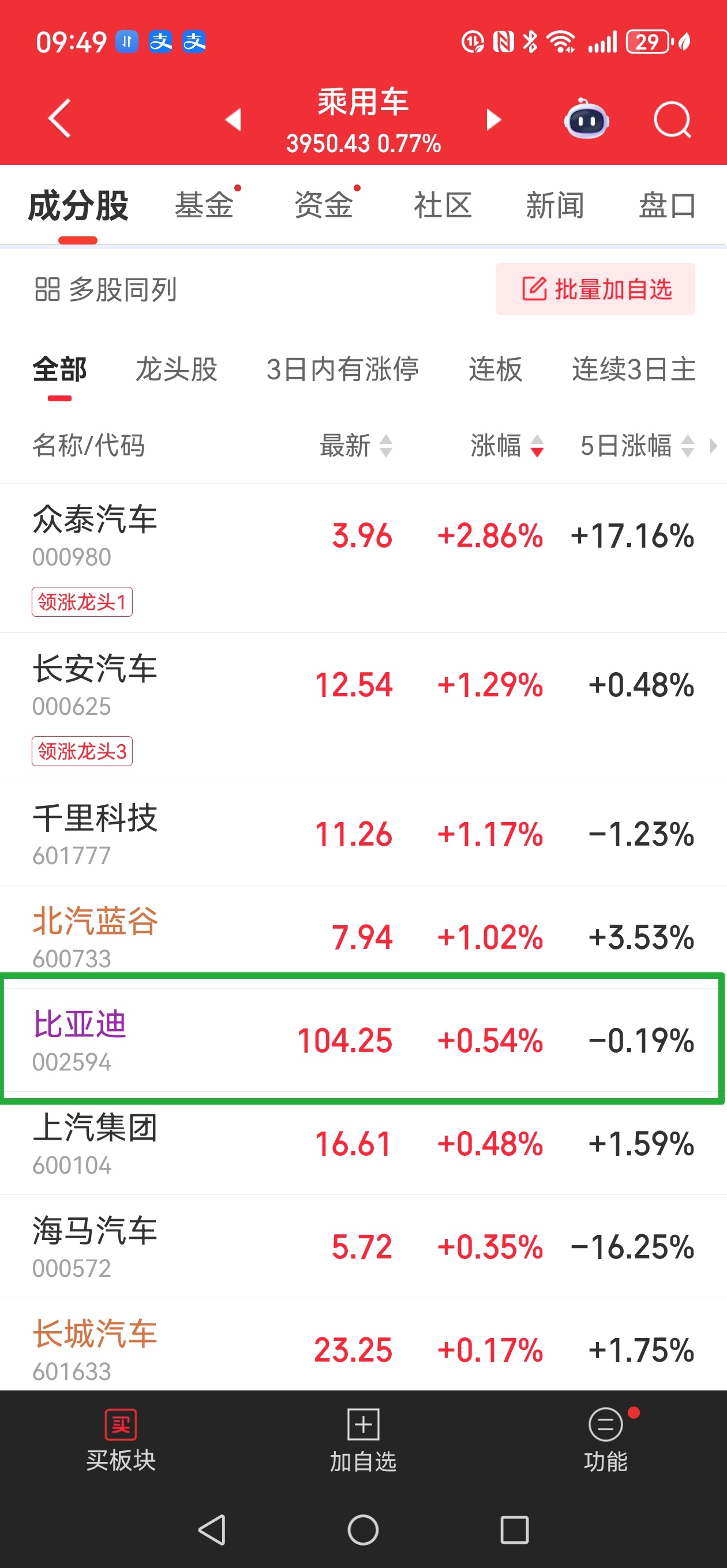 $比亚迪(SZ002594)$ 汽车板块,众泰汽车是领涨的龙头。这5天涨超过17个点,比亚迪专治各种不服。