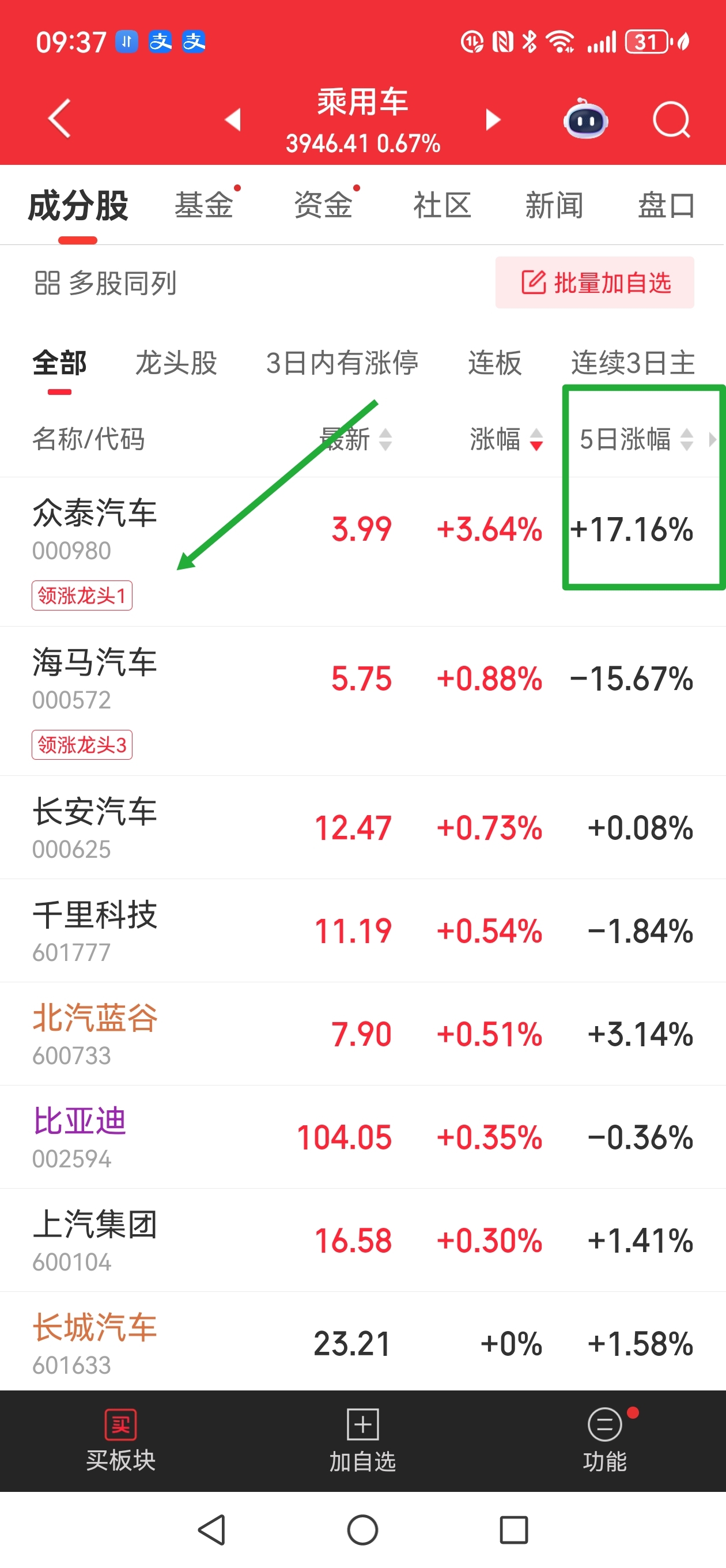 汽车板块,众泰汽车是领涨的龙头。这5天涨超过17个点,比亚迪专治各种不服。