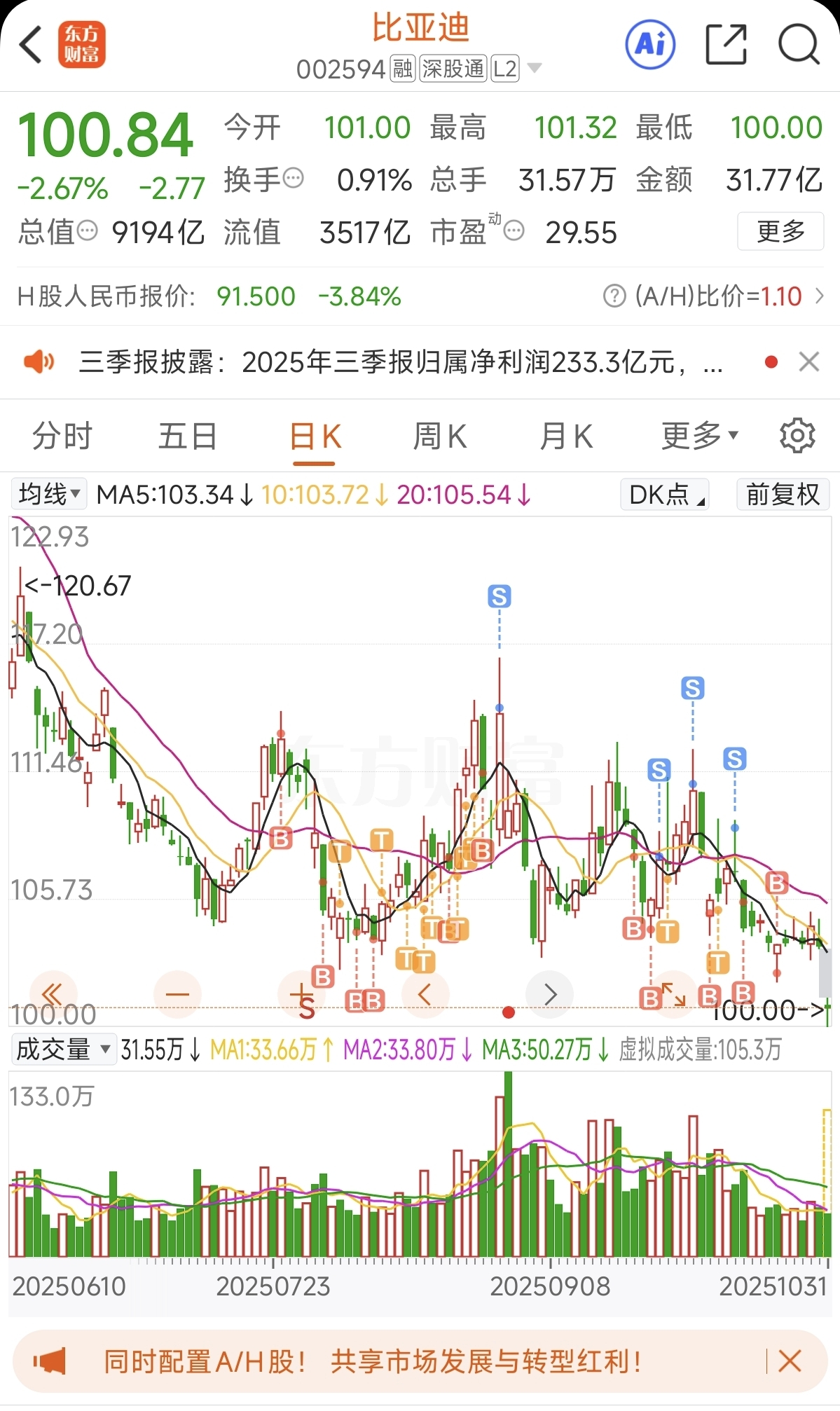 $比亚迪(SZ002594)$ 从110多成本做到100,还是被你追上了