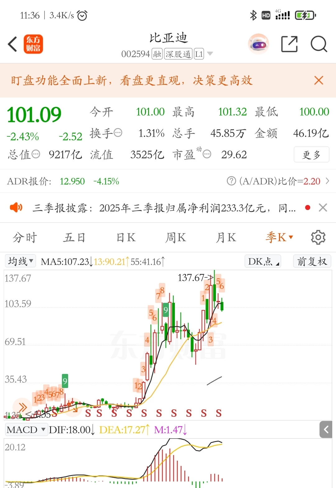 $比亚迪(SZ002594)$ 季线走出这样的形态,一轮很长时间的股价下跌调整开始了