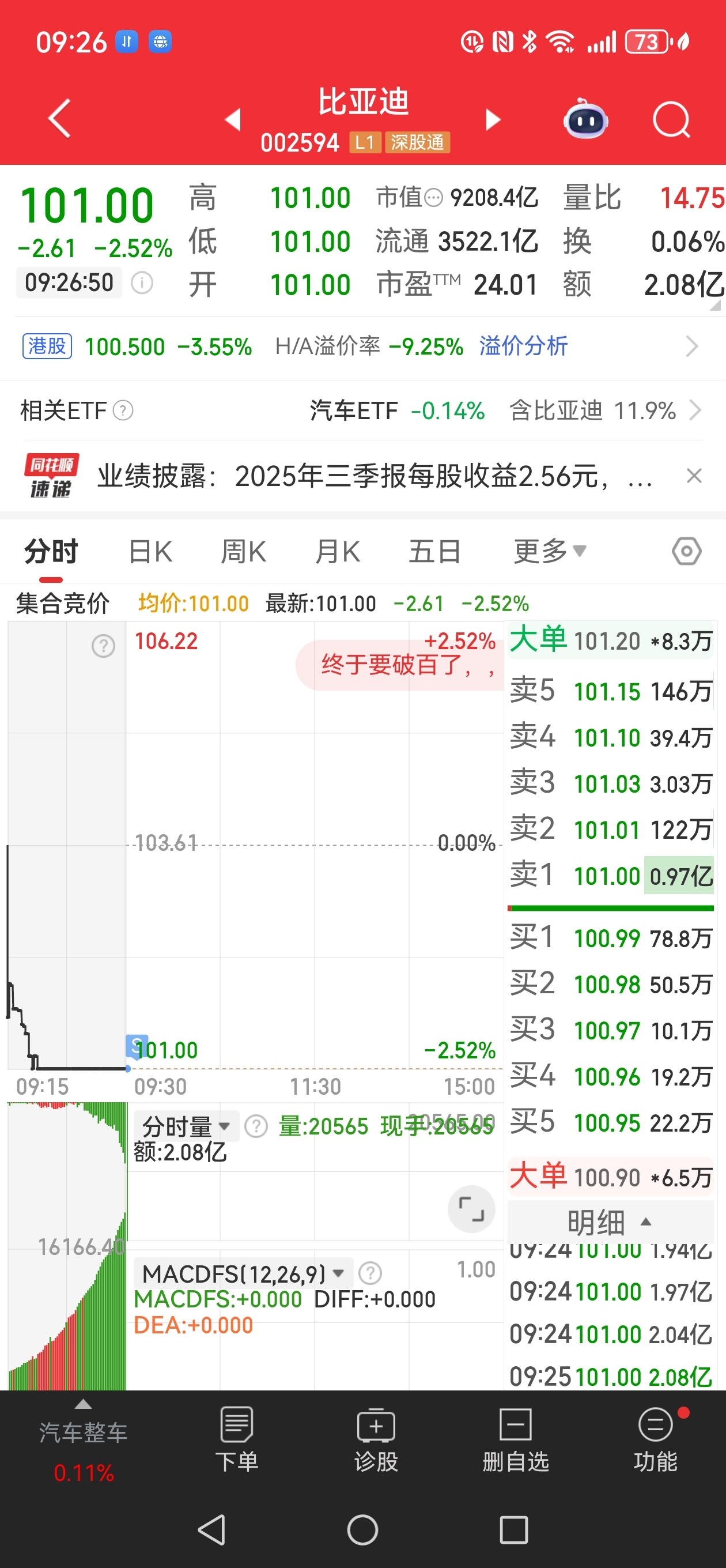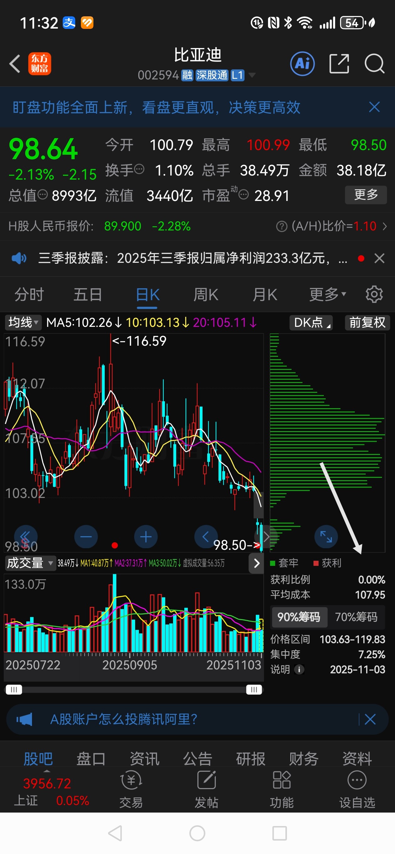 10月30日晚上比亚迪三季报披露后,次日开盘我101.00卖出,不再抱有任何幻想