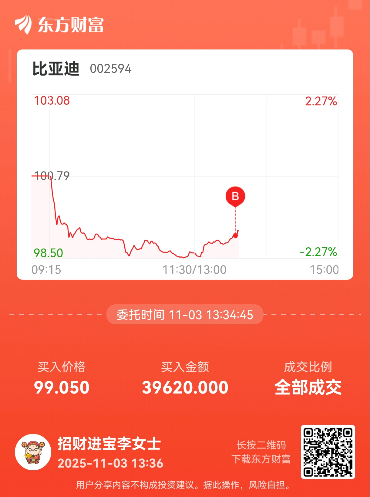 $比亚迪(SZ002594)$ 想当初还是三百多的股价,分红之后变到一百多,难得看到100以下的比亚迪,加仓了。