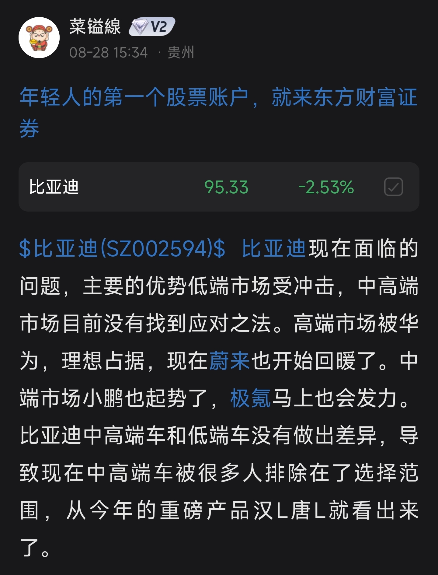 $比亚迪(SZ002594)$ 之前就说了,比亚迪陷入了困境,很多人根本没有了解购车市场,只去看个销量数据,比亚迪的设计以及中高端之路,目前还看不到应对之法