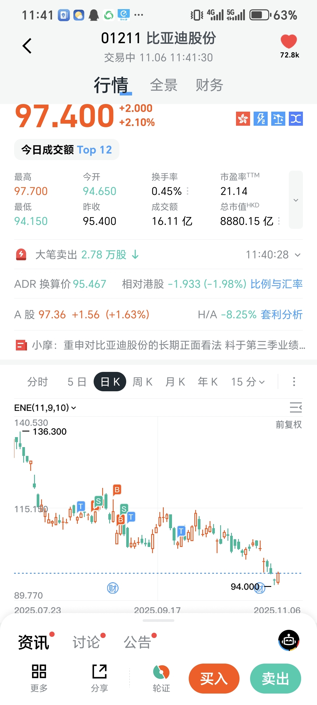$比亚迪(SZ002594)$ 在A股买点比亚迪试试水。之前买的港股,中途退出了,亏了不说,手续费和汇率都坑死我了。