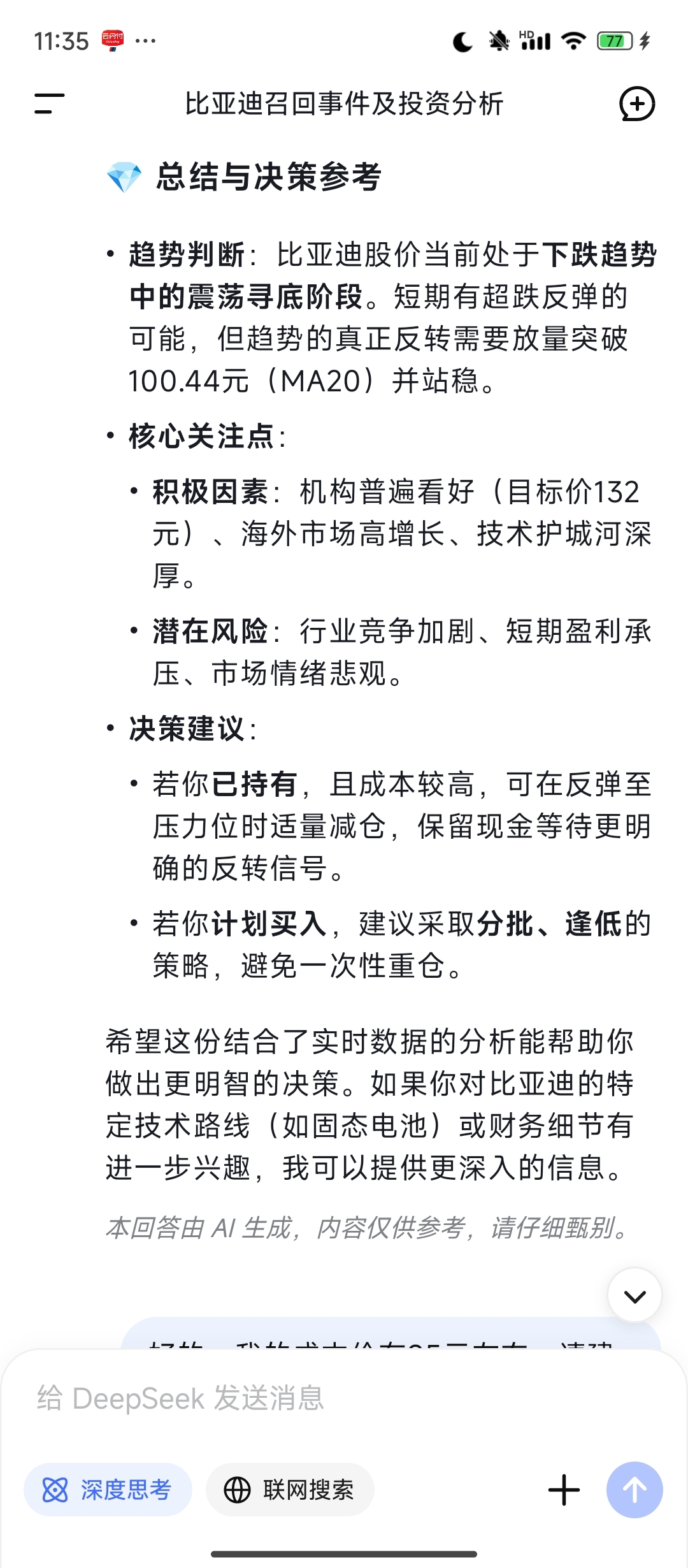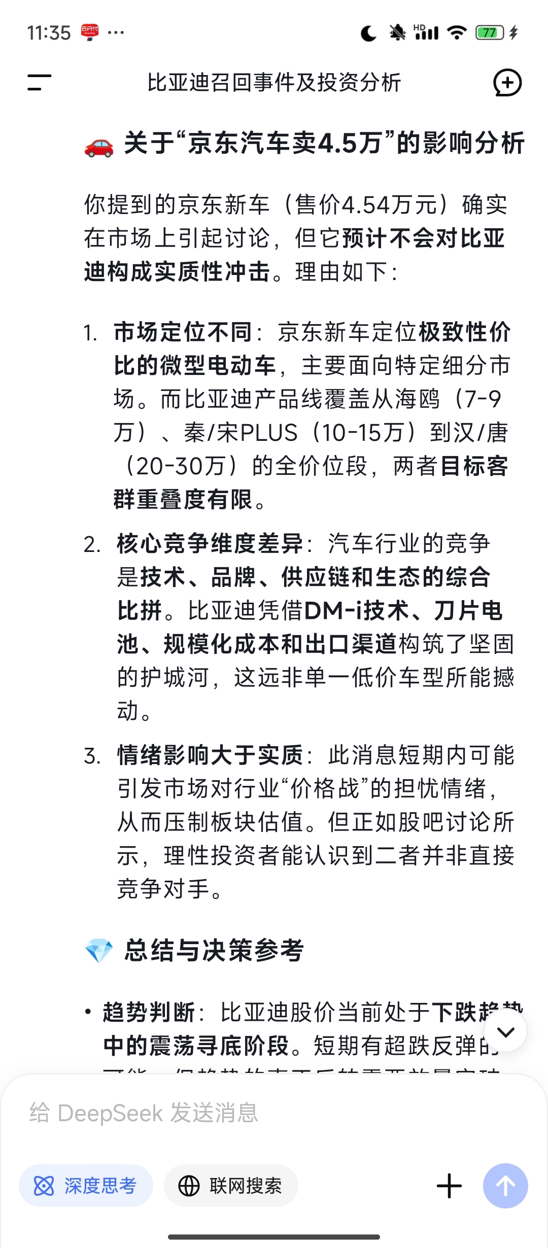 给已经持有比亚迪的吃个定心丸。京东那些低价车不能造成什么实质性的影响。看一下ai