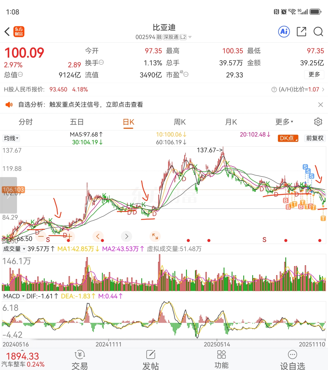 $比亚迪(SZ002594)$ 这算小散的yy吗?纵观比亚迪历史股性,几乎每次主升前的横盘震荡都要破位一次,所以这次破位前我就已经做好了破位的准备,破位期间持股不动