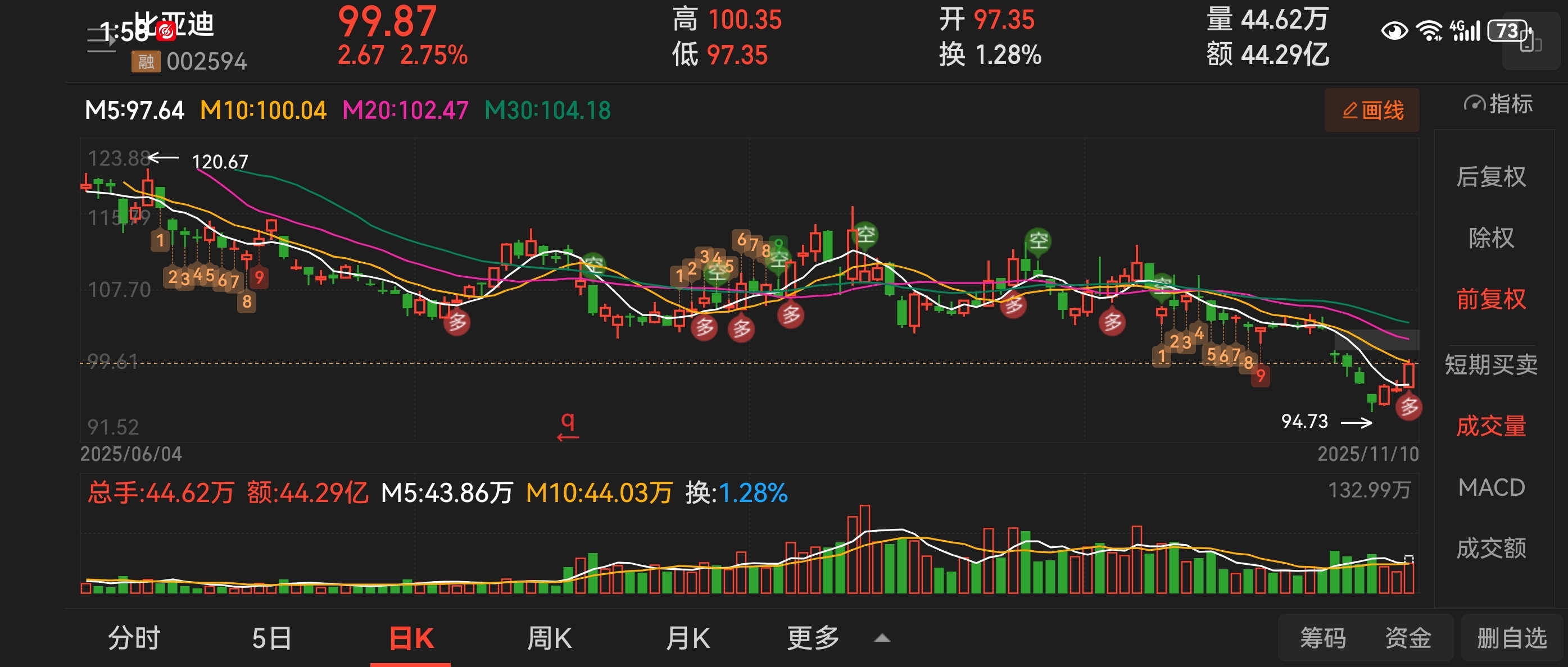 $比亚迪(SZ002594)$ 11.6日分享比亚迪,底部支撑有效,继续看反弹