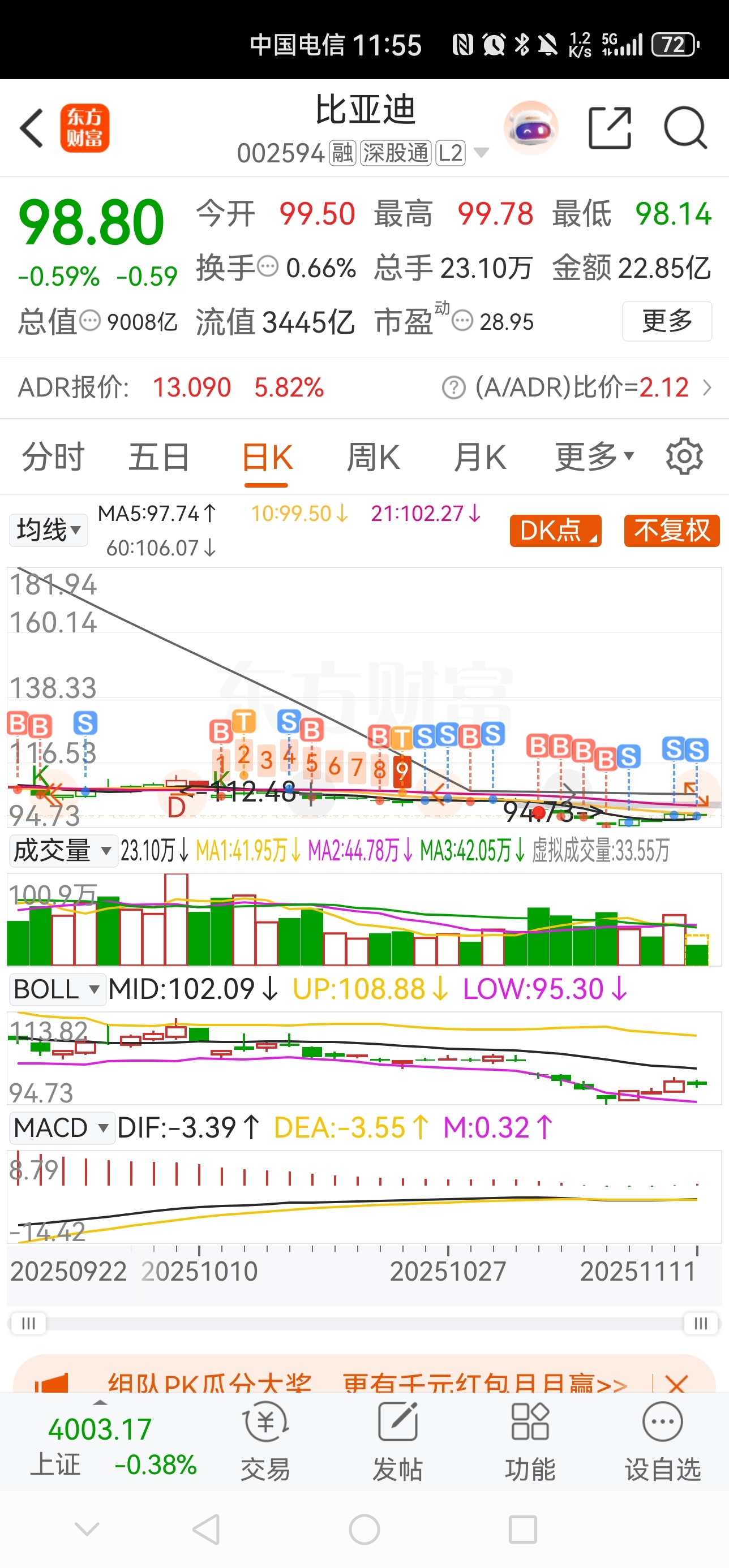 $比亚迪(SZ002594)$ 没站稳100,清仓了,估计会到95