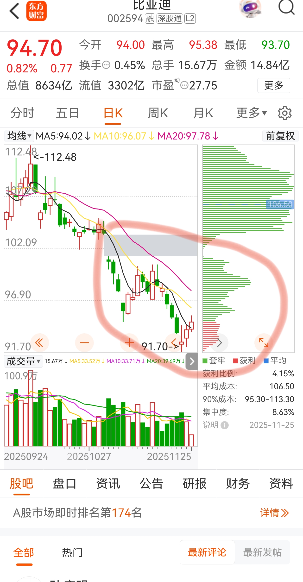 $比亚迪(SZ002594)$ 短期内最多就在这个区间徘徊了,缺口上面的套牢资金没戏,除非他们割肉走人。91-101区间。