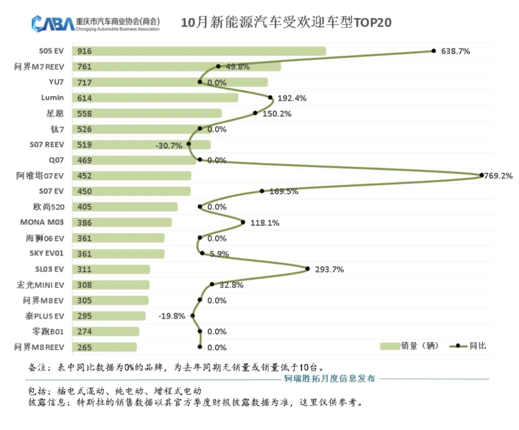 10月份,新能源汽车受欢迎车型TOP20中,深蓝S05纯电版(916辆)、问界M7增程版(761辆)、小米YU7(717辆)分别位居销量前三。