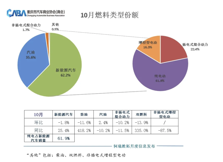 增长依旧是新能源汽车市场的主旋律。10月份,新能源汽车销量同比增长25.4%,其中纯电车型占新能源销量的比例达61.9%。