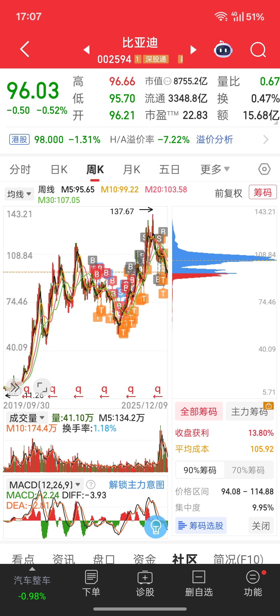 $比亚迪(SZ002594)$ 目前底仓12手,准备能到80元加25手,能到60—65元再加140手,压上全部身家。对于比亚迪这种优质企业,下跌是给我们捡钱的机会,我太渴望暴跌了。