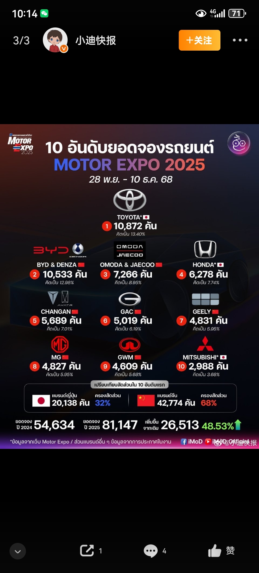 $比亚迪(SZ002594)$ 比亚迪在泰国车展销量挺不错的。排第二,离第一的丰田差距不大。