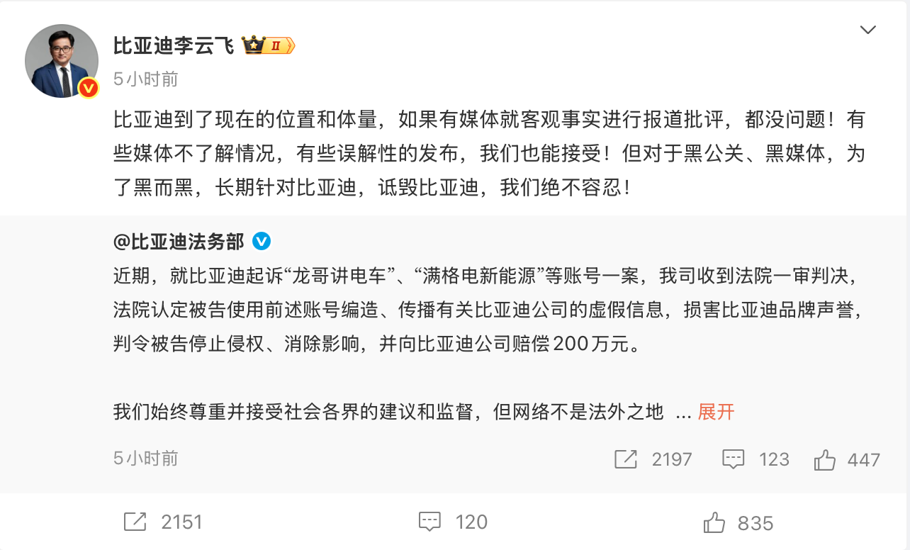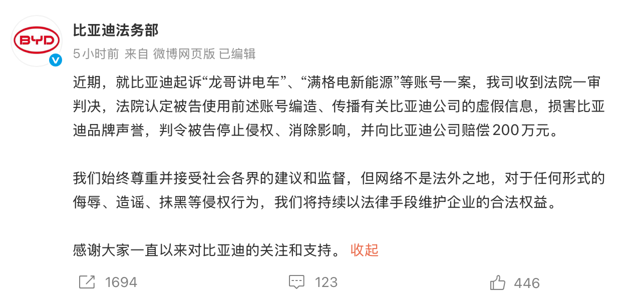 比亚迪今年以来公开了多起网络侵权案件。9月2日,比亚迪法务部发文称,自媒体“龙猪-集车”及其相关账号因长期发布大量有关比亚迪的不实及侮辱诋毁信息,一审判决认定其构成侵权,判令被告:赔礼道歉、删除侵权言论,并赔偿比亚迪经济损失等共计201.87万元;二审维持原判。近期,经法院强制执行,判赔金额201.87万元已执行到账,同时自媒体“龙猪-集车”及相关账号的实控人向比亚迪予以书面致歉。