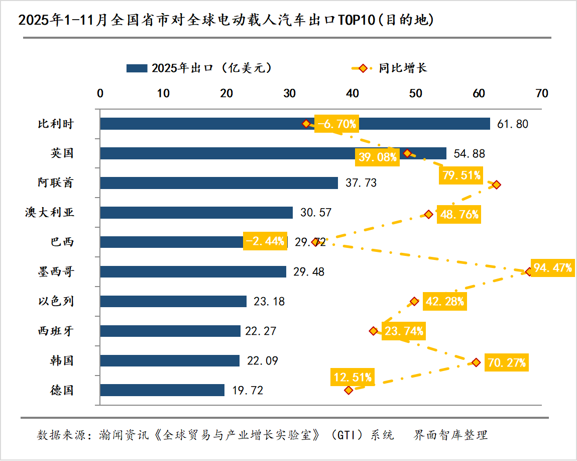 从出口目的地所属大洲维度分析,中国电动载人汽车出口正加速构建“核心市场筑底盘、潜力市场拓增量”的双轮驱动格局。核心市场方面,亚洲与欧洲持续担当“压舱石”角色。亚洲是中国汽车出口的战略核心区,11月对49个国家的出口额达30.37亿美元,较2024年同期实现翻倍增长,基本盘地位进一步巩固。与此同时,欧洲市场表现强劲,在覆盖的39个国家中,出口额跃升至22.53亿美元,较去年同期的10.89亿美元显著提升,展现出中国车型在高端市场的持续竞争力。