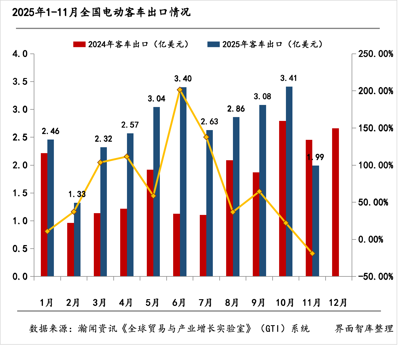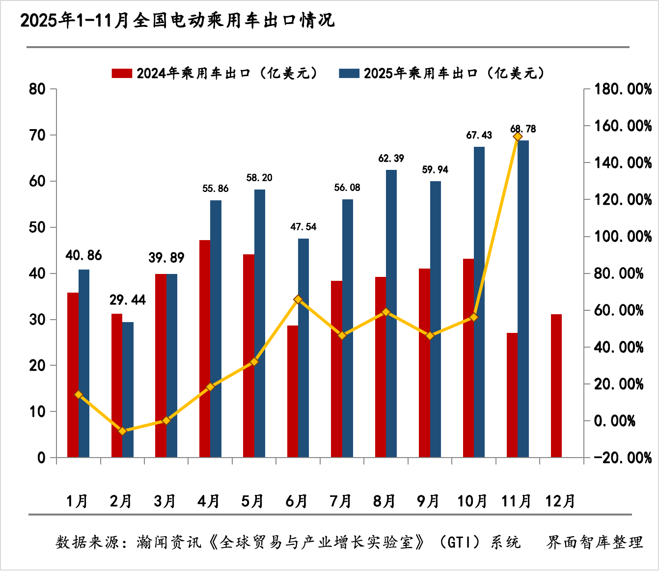 根据界面智库与瀚闻资讯统计,2025年11月,中国电动载人汽车贸易增长动能全面爆发,结构性分化态势进一步凸显。进口方面延续收缩态势,出口方面则展现出强劲的加速势头,11月当月出口金额达70.76亿美元,同比大幅增长139.83%,环比微降0.11%;出口数量达39.94万辆,同比激增144.93%,环比增长6.52%。1-11月累计出口量已达337.31万辆,同比增长63.59%,增速较1-10月显著扩大6.99个百分点,全球市场拓展进入高速增长通道。