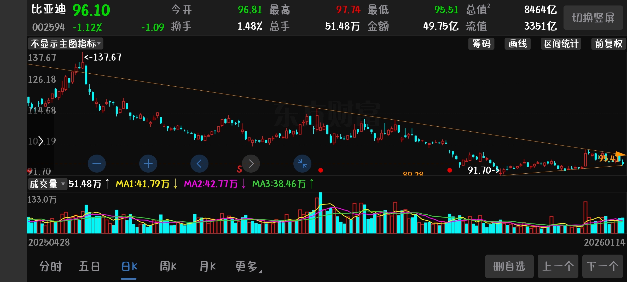 $比亚迪(SZ002594)$ 各位大佬,看看这两根线画的怎么样,是不是一个三角形收敛,要选择方向了,差不多半个月一个月样子