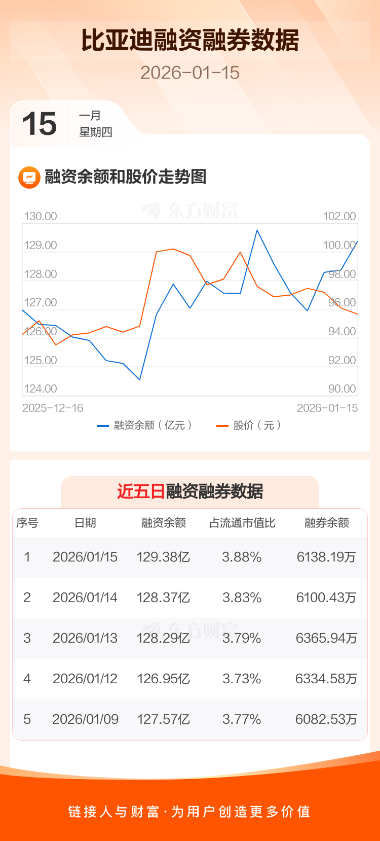 交易所最新数据显示,比亚迪于2026年1月15日获融资买入3.14亿元,融资偿还2.13亿元,当日融资净买入1.01亿元。目前,该股融资余额129.38亿,占流通市值比例为3.88%。