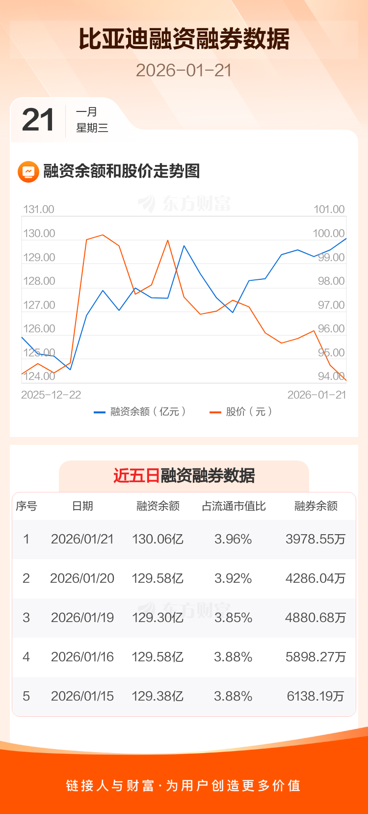 交易所最新数据显示,比亚迪于2026年1月21日获融资买入2.70亿元,融资偿还2.22亿元,当日融资净买入4768.89万元。目前,该股融资余额130.06亿,占流通市值比例为3.96%。