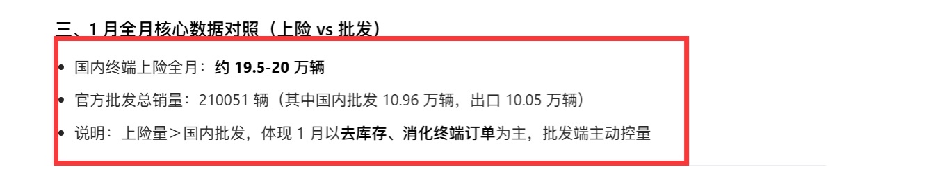 1月全月核心数据对照(上险vs批发)国内终端上险全月:约19.5-20万辆官方批