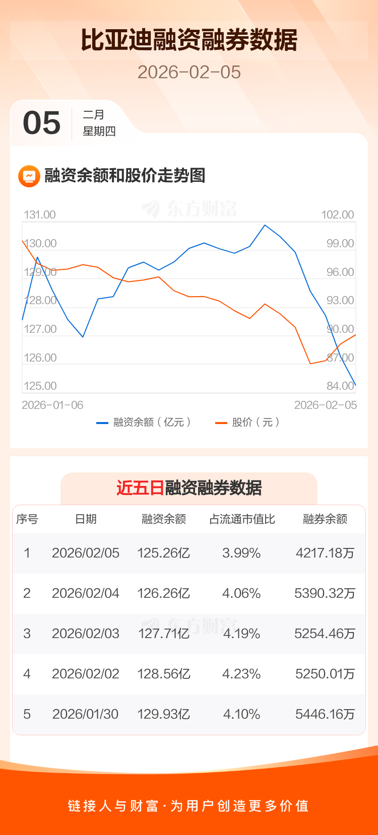 交易所最新数据显示,比亚迪于2026年2月5日获融资买入2.12亿元,融资偿还3.12亿元,当日融资净偿还1亿元。目前,该股融资余额125.26亿,占流通市值比例为3.99%。