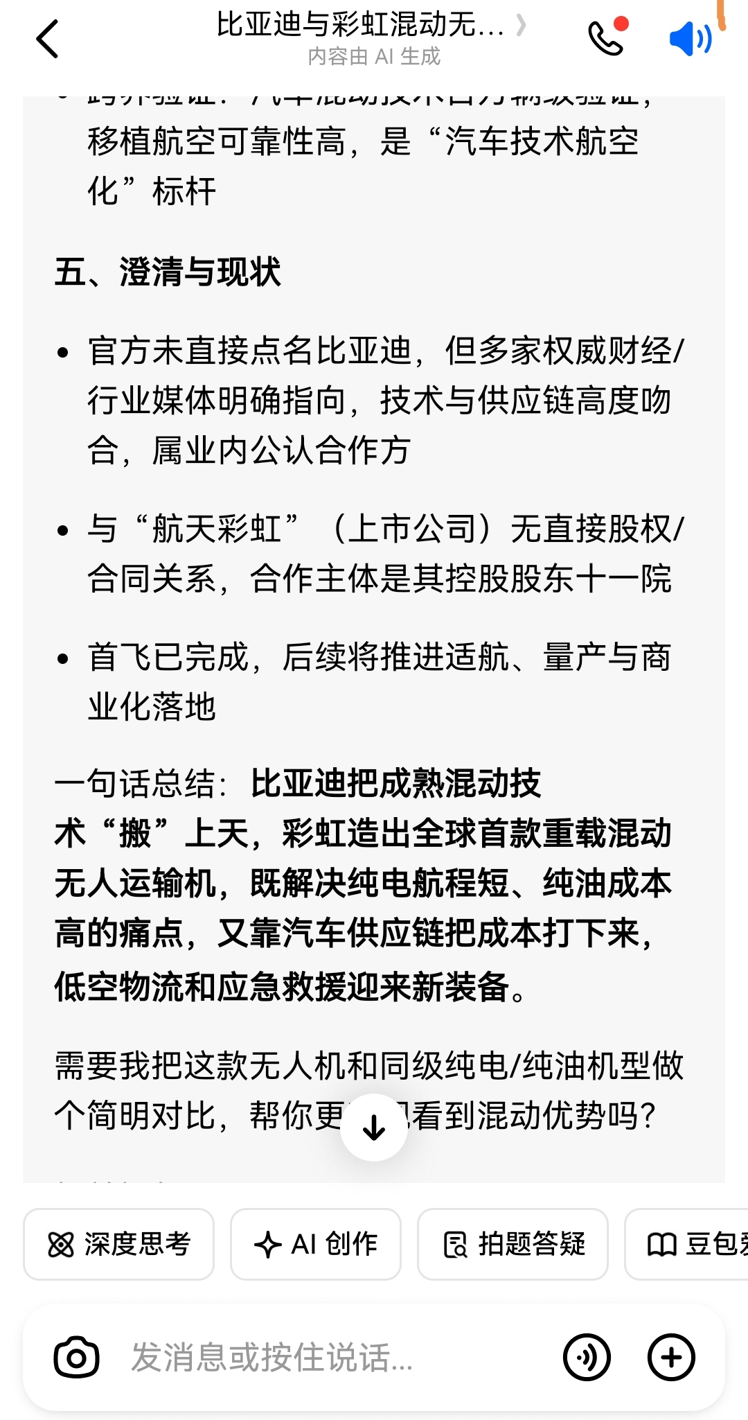 $比亚迪(SZ002594)$ 航天彩虹混动无人机豆包分析合作供应商是比亚迪,相信豆包的分析,比亚迪未来又一主力增长点,妥妥的军工无人机核心供应商