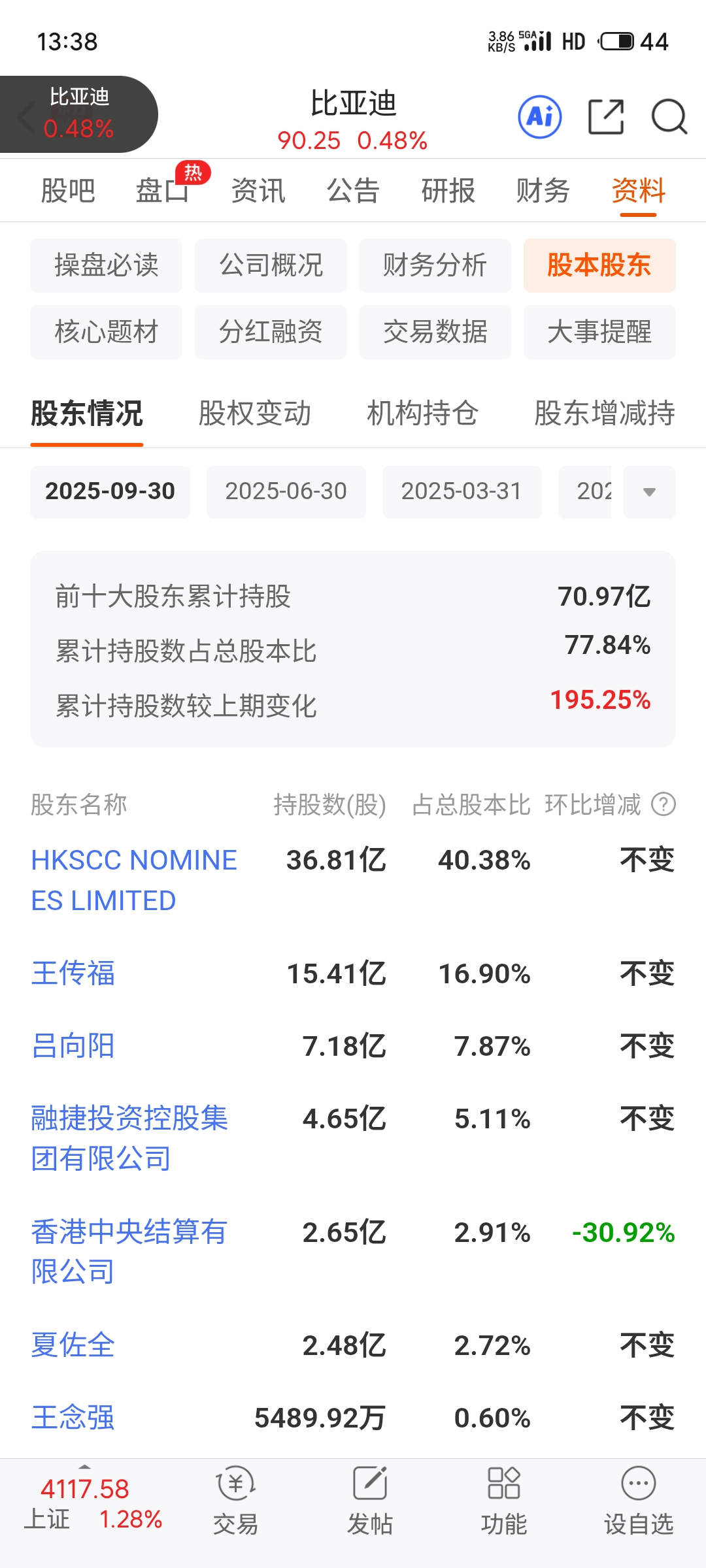 $比亚迪(SZ002594)$ 比亚迪股东构成看,实际已经变成了外企。前十大股东持股占比77%实际在散户手中的筹码估计15%都不到,说因为散户多不涨的,根本成立不了。根本问题是国内机构目光短浅没有持仓,导致控股权丧失的问题
