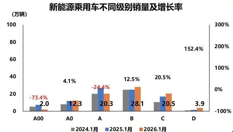 数据显示,1月,A00级新能源乘用车销量为2万辆,同比下滑幅度高达73.4%;A级新能源乘用车销售20.3万辆,同比下滑24.4%。“2026年‘两新’政策优化后推出,按照车型售价比例给予补贴优惠,对于价格较低的车型影响比较大。”陈士华指出,从1月份乘用车销量数据也可看出整体车市变化趋势,乘用车25万元以上价格区间市场中新能源车好于传统燃料车。