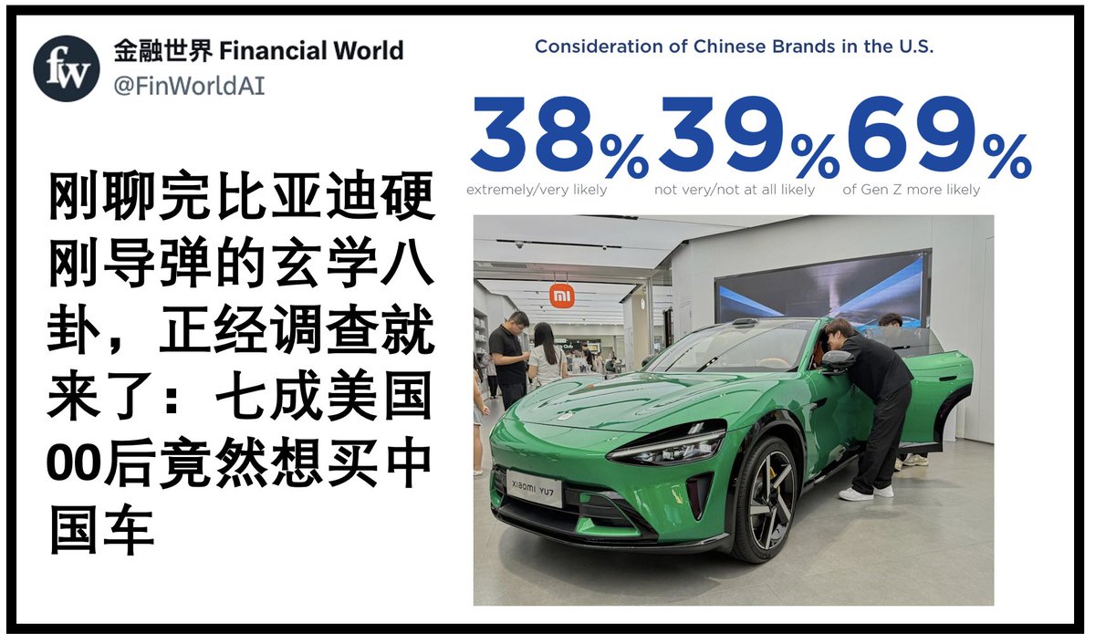 美国汽车数据公司Cox的最新调查直接撕开了硅谷的体面。数据显示,竟然有高达69%的美国Z世代00后明确表示会考虑购买比亚迪、吉利等中国品牌。相比之下,那些老牌美国车主的忠诚度在价格面前碎了一地。原因极其扎心,美国新车均价已经冲向5万美金,而比亚迪海豚在海外才卖2.5万,这种降维打击让还没攒够钱的美国年轻人根本无法拒绝。虽然目前美国还顶着100%的关税大棒,且老一辈车主还抱着情怀不撒手,但年轻一代更看重的是新鲜的设计和真金白银的性价比。更有趣的是,如果这些中国品牌选择跟福特这种美国老牌联手,消费者的购买意愿会瞬间飙升到76%。虽然福特和小米之前都否认了合资传闻,但这份调查已经把真相拍在了底特律的脸上:在这个被高物价折磨的2026年,什么品牌信仰、地缘政治,在绝对的便宜和好用面前,可能真的不如一辆比亚迪来得实在。这就是赤裸裸的现实:中国电车在海外的未来,可能正握在这群不信邪的美国年轻人手里。
