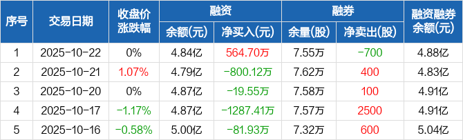 豪迈科技:融资净买入564.7万元,融资余额4.84亿元(10-22)
