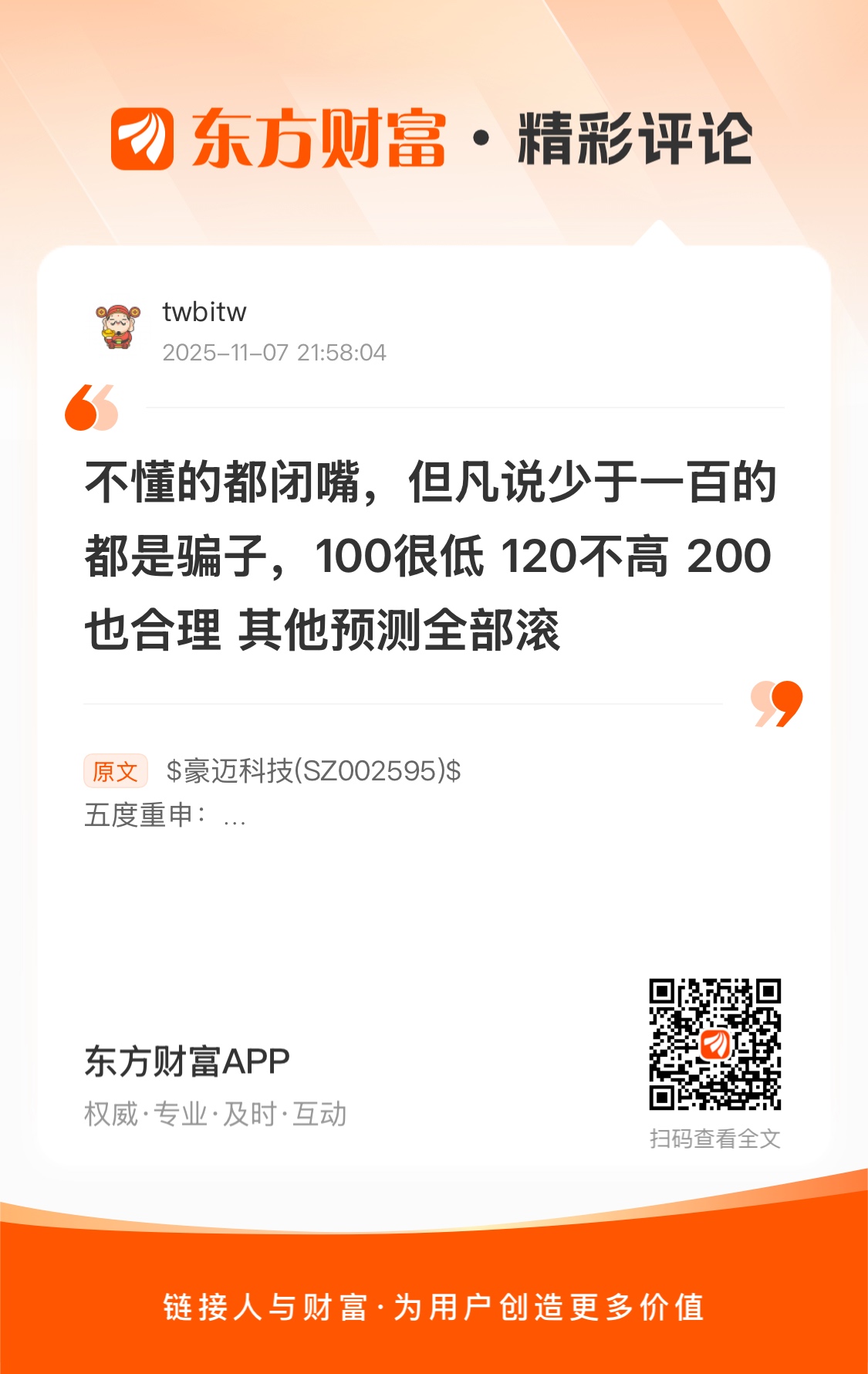 温馨提示: 1.根据《证券法》规定,禁止编造、传播虚假信息或者误导性信息,扰乱证券市场;2.用户在本社区发表的所有资料、言论等仅代表个人观点,与本网站立场无关,不对您构成任何投资建议。用户应基于自己的独立判断,自行决定证券投资并承担相应风险。《东方财富社区管理规定》