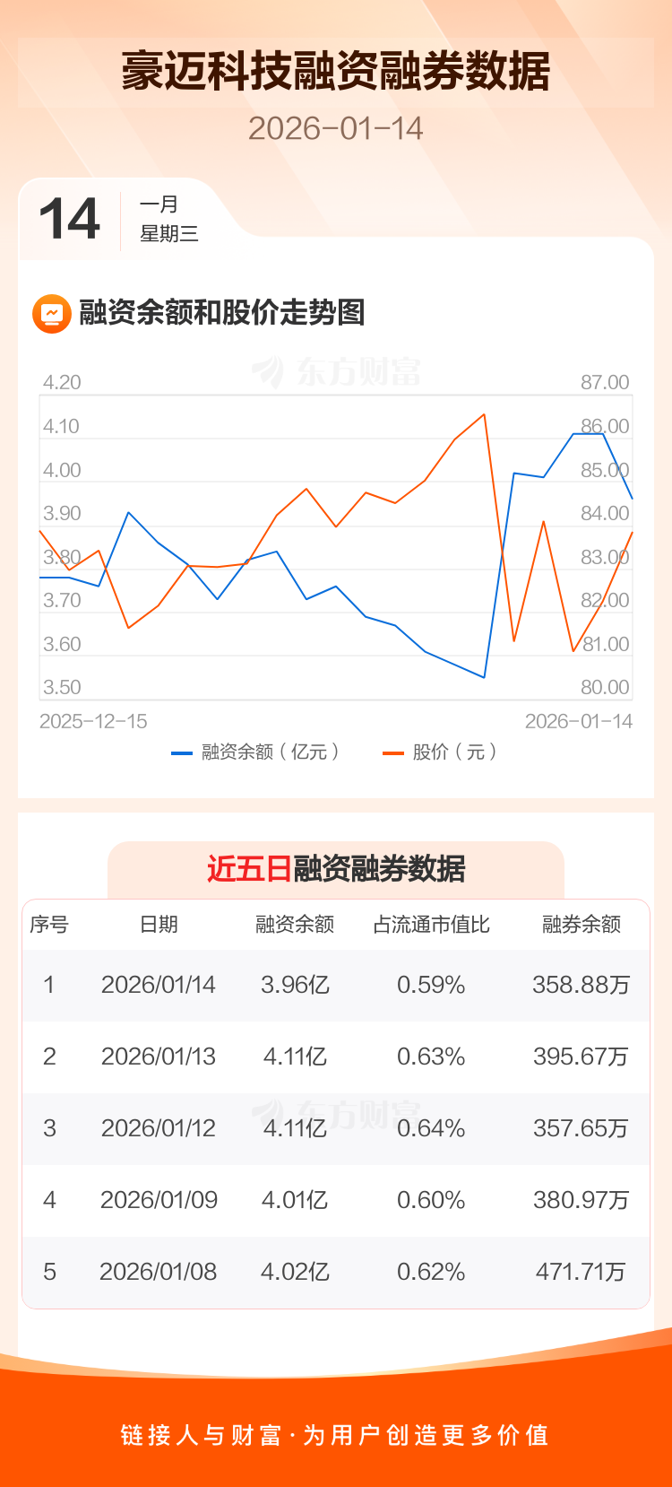 交易所最新数据显示,豪迈科技于2026年1月14日获融资买入1964.40万元,融资偿还3444.89万元,当日融资净偿还1480.49万元。目前,该股融资余额3.96亿,占流通市值比例为0.59%。