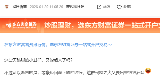 温馨提示: 1.根据《证券法》规定,禁止编造、传播虚假信息或者误导性信息,扰乱证券市场;2.用户在本社区发表的所有资料、言论等仅代表个人观点,与本网站立场无关,不对您构成任何投资建议。用户应基于自己的独立判断,自行决定证券投资并承担相应风险。《东方财富社区管理规定》