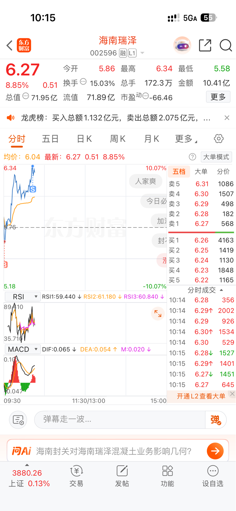 $海南瑞泽(SZ002596)$ 留一层仓位与主力共舞