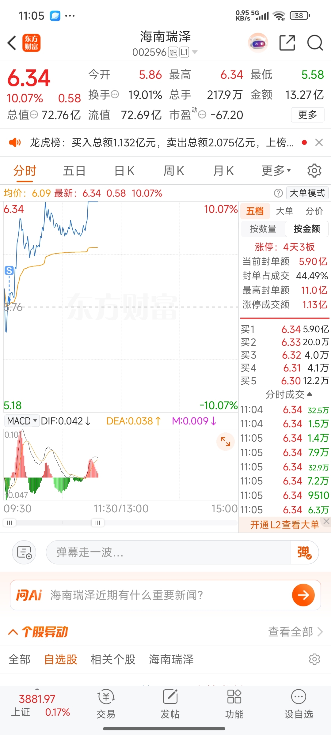 $海南瑞泽(SZ002596)$ 卖飞6个我有才