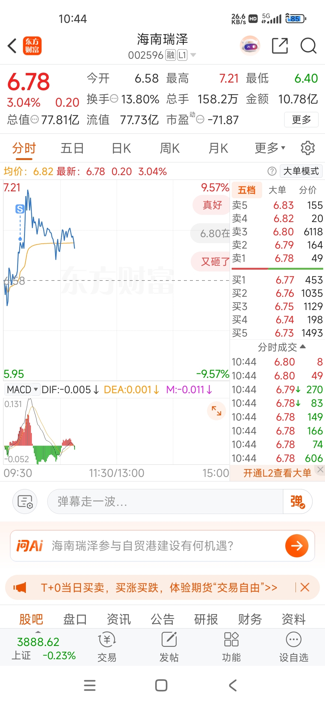 $海南瑞泽(SZ002596)$ 一个电话让我错过高点了,那就不出了