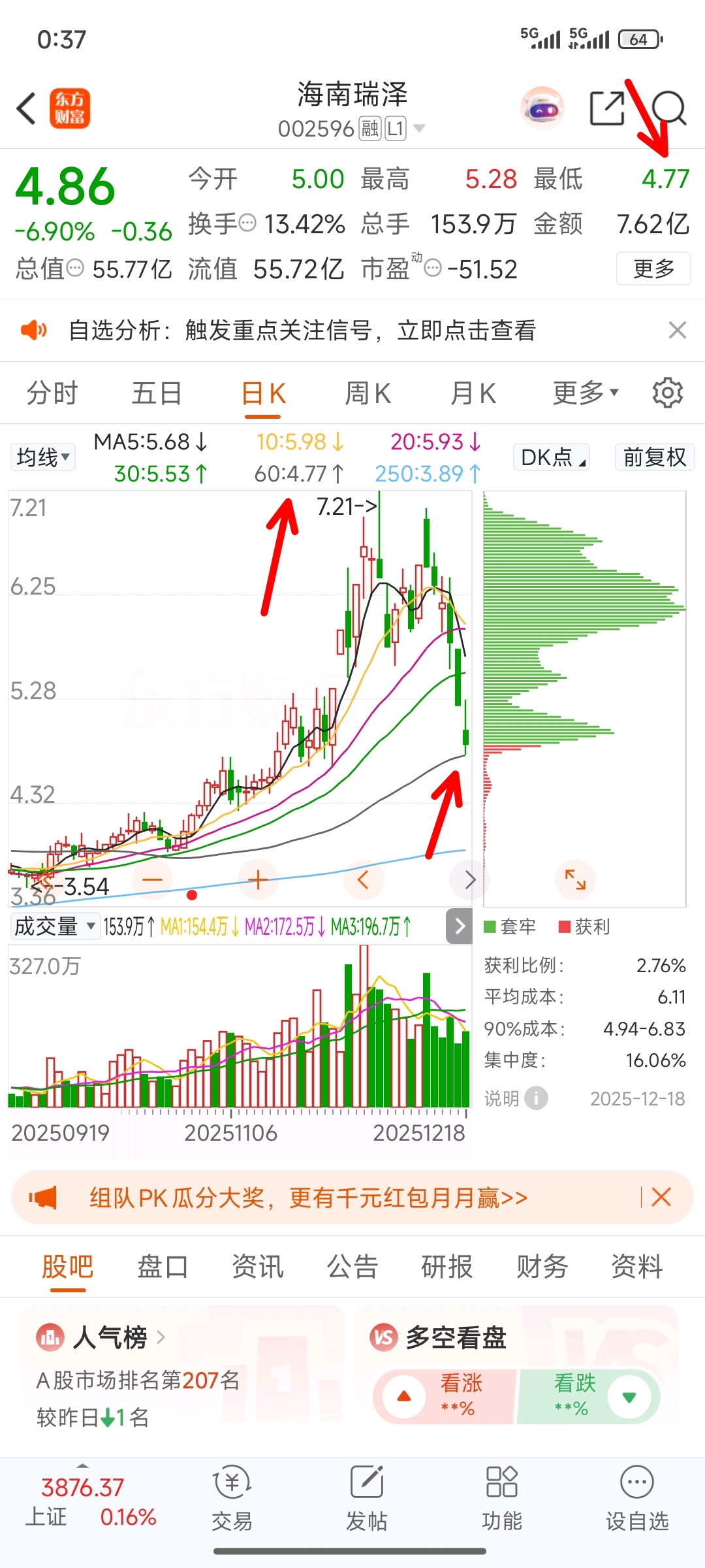 $海南瑞泽(SZ002596)$ 60日线止跌了,明天会有一些反弹