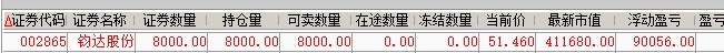 海南板块周末的利好出现了大面积涨停,明天个股也会出现大面积分化,这个板块里面今天也有很多票都是涨停开板的,说明封单意愿不强,我手中的钧达股份今天51.36一股不留全部走了