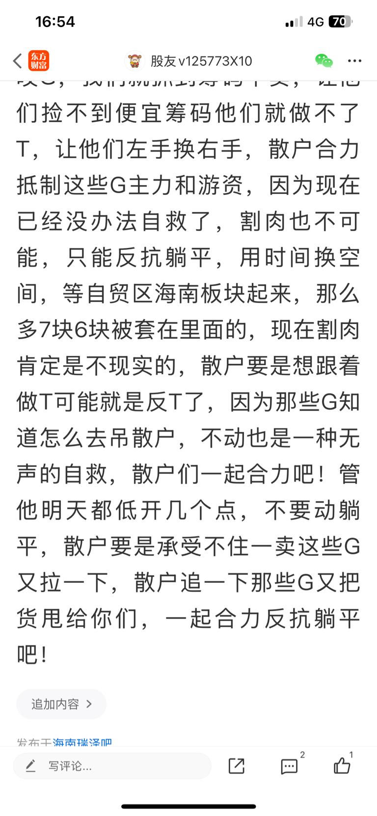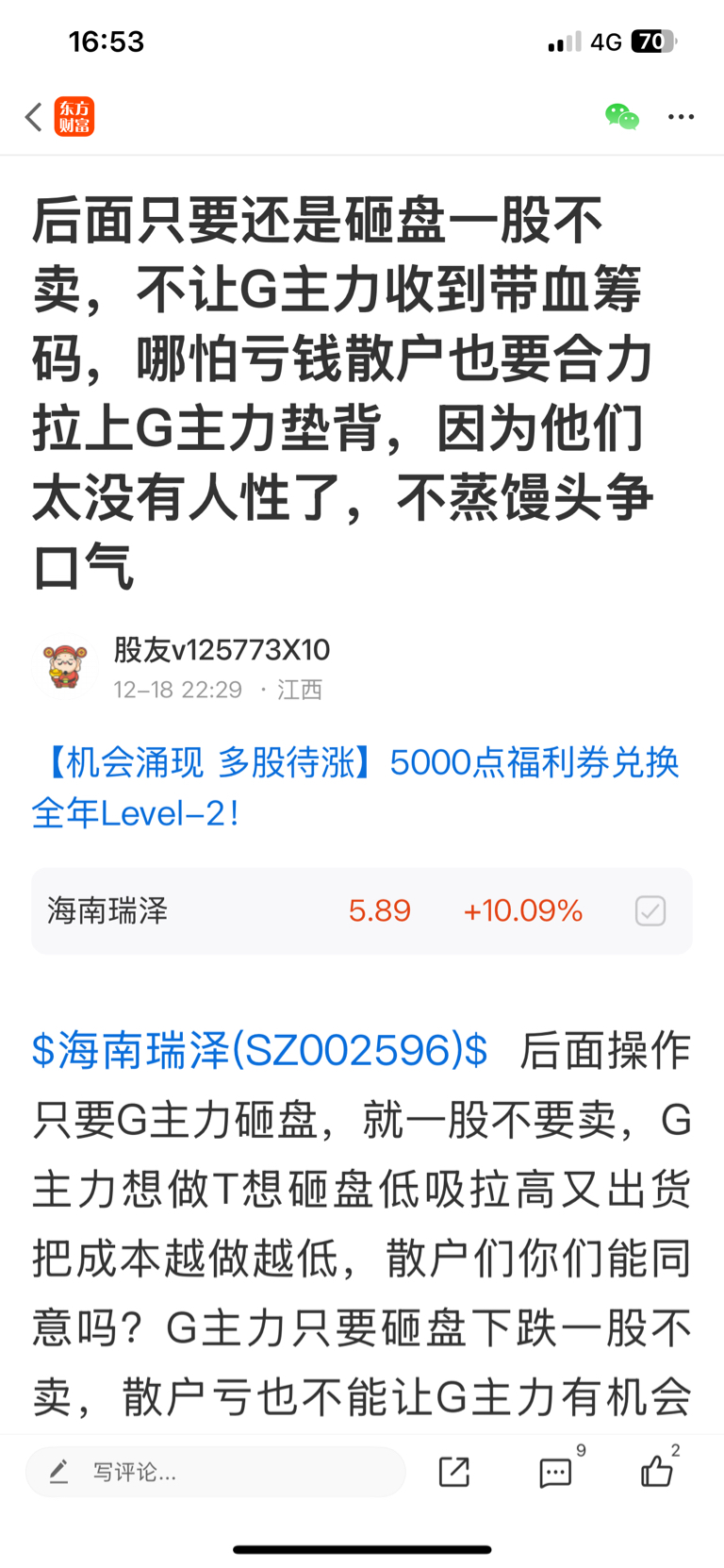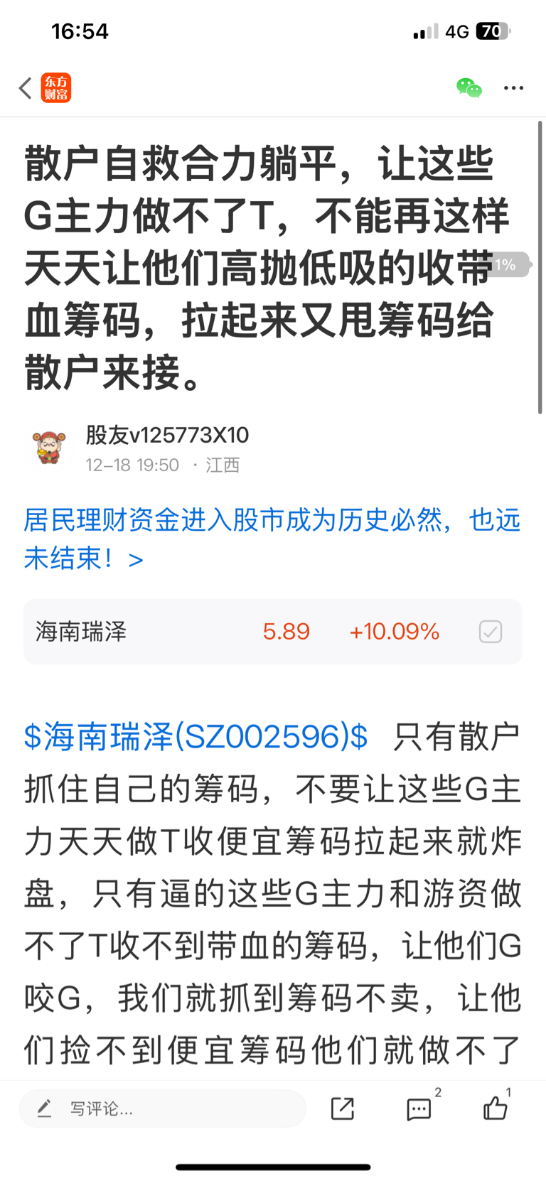 $海南瑞泽(SZ002596)$ 多少散户韭菜在最高买进去,在最低点跑路了,也是该哟!叫你们一起合力自救持股不动,没有买卖就没有伤害,起码主力不会反复收割,反复做T把成本价越做越低是不是,持股不动就好了,不听好了咯,带血的筹码全部被主力收去了现在舒服了吧,现在只能站在门外看别人回本获利,自己现在进又怕被刀,不进看着别人获利,自己血亏。