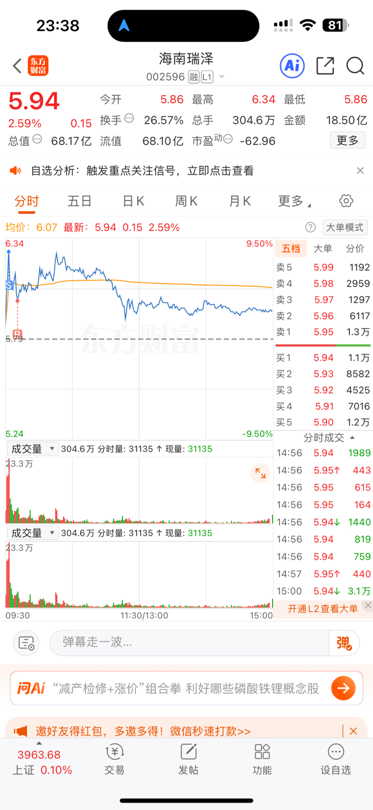 $海南瑞泽(SZ002596)$ 刚刚解套,又套进去了,主力很不是好东西,下周跑了