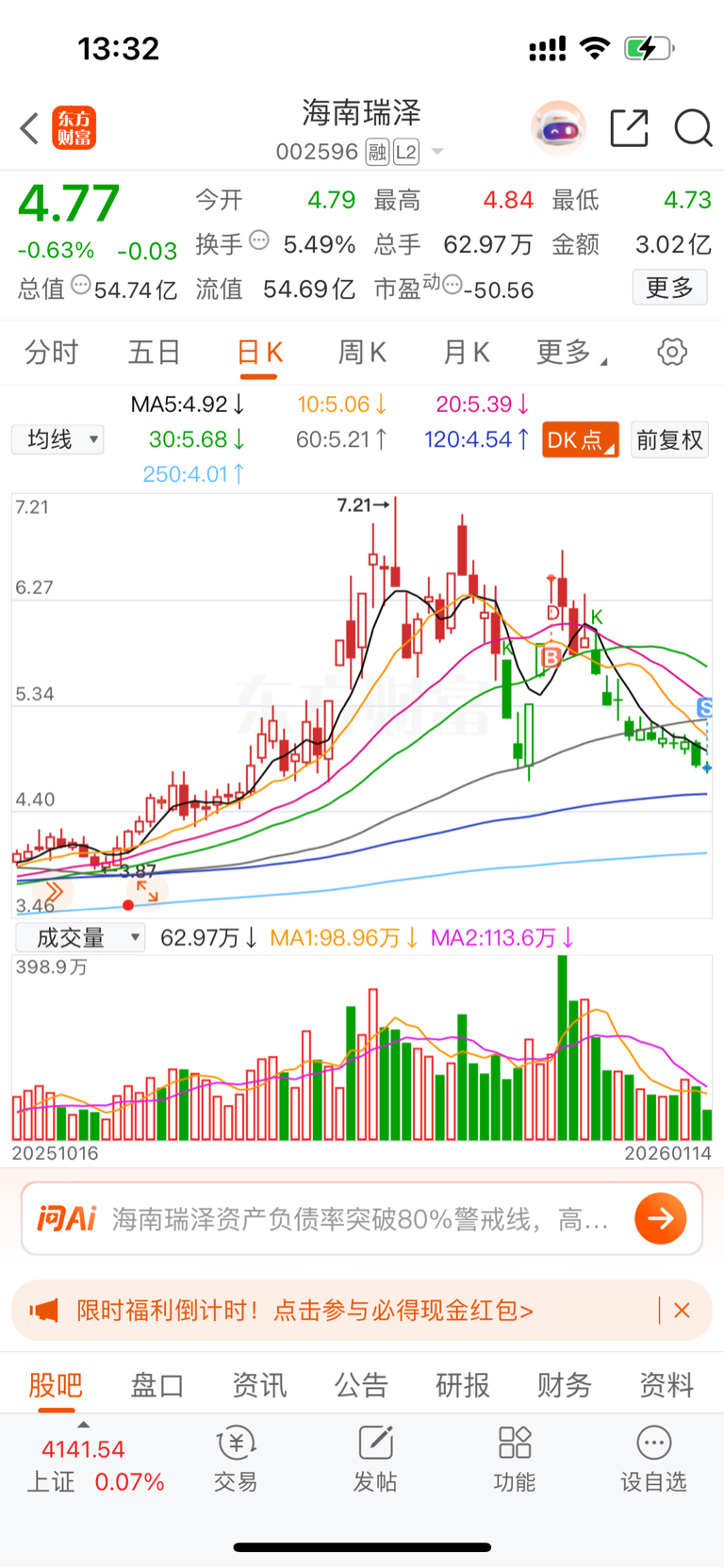 $海南瑞泽(SZ002596)$ 割肉了,你可以涨了吧
