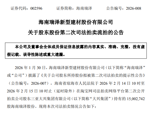 公告显示,2026年1月30日,海南瑞泽披露了《关于公司股东所持股份拟被第二次司法拍卖的提示性公告》,海南省琼海市人民法院于2026年2月14日10时至2026年2月15日10时止(延时除外)在淘宝网司法拍卖网络平台第二次公开拍卖公司股东三亚大兴集团有限公司(以下简称“大兴集团”)持有的15,002,742股海南瑞泽股份。
