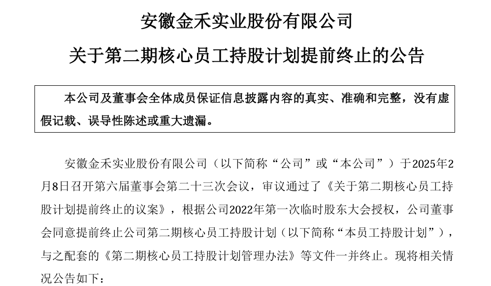 11日晚,金禾实业同时宣布,公司第二期核心员工持股计划提前终止。